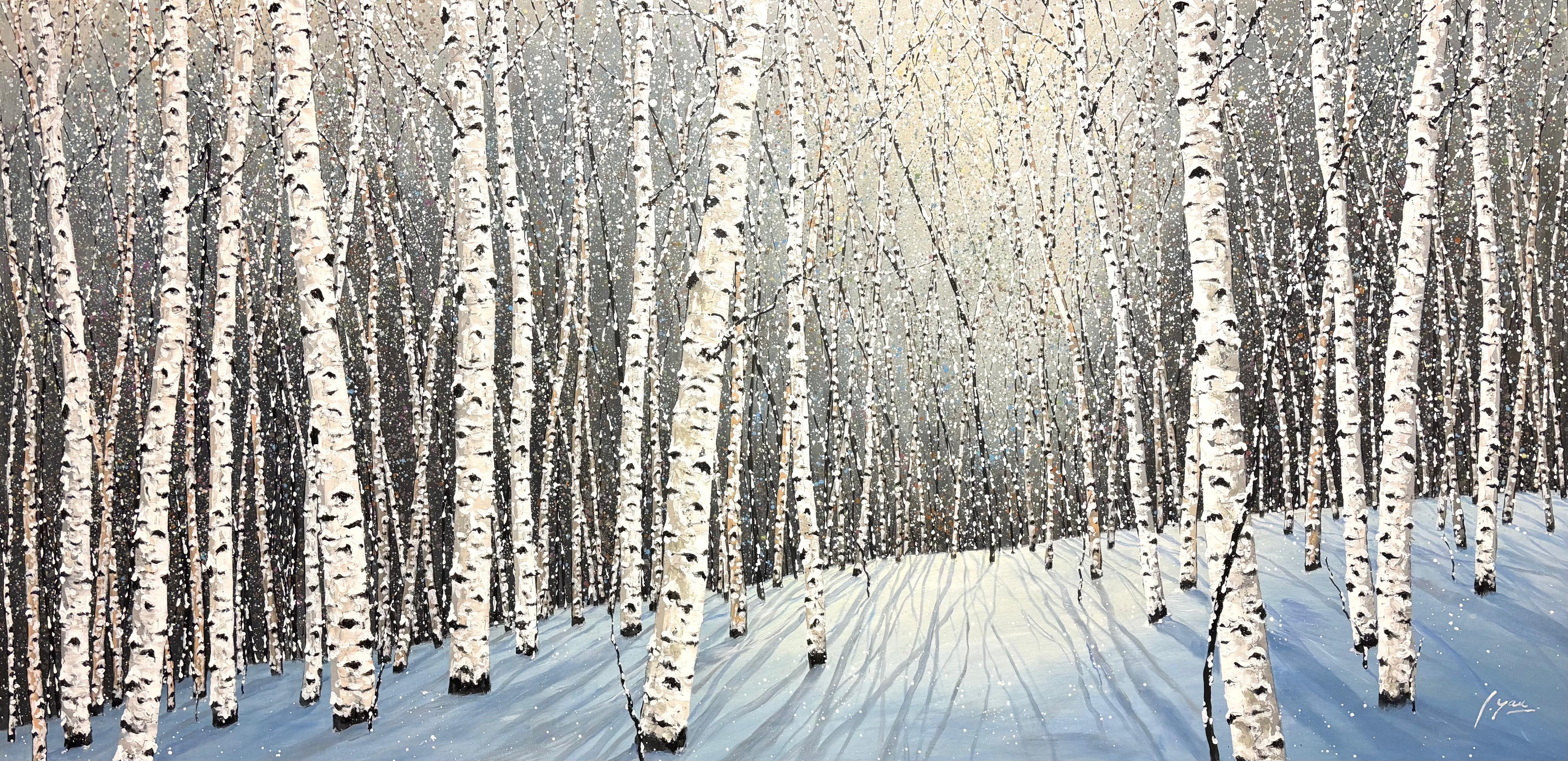 His Land Series, rooted in the calming presence of birch trees, blends abstraction with realism, inviting viewers to engage in quiet reflection. Complex webs of splattered and washed colour transform these trees into powerful symbols of serenity and resilience.