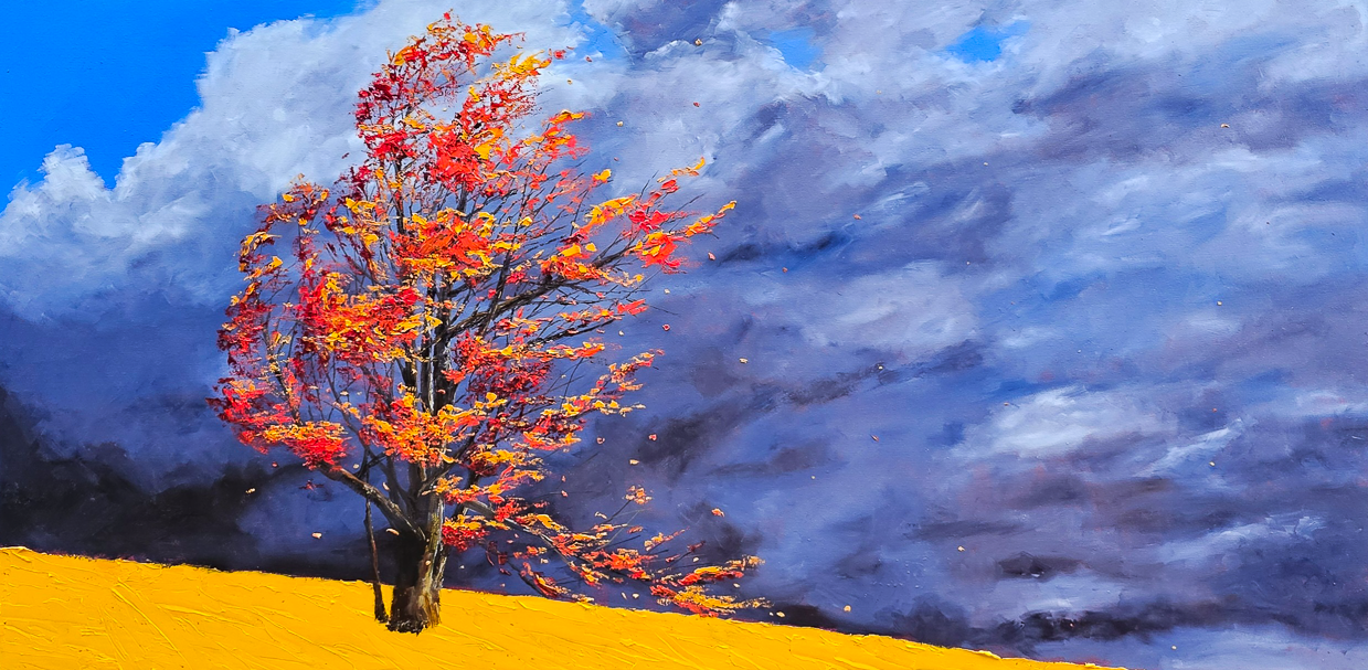 His works are rich in texture, bold in colour, and powerful in shadow, pulling viewers into the heart of a windswept forest, a glowing sunset, or a still, reflective lake.