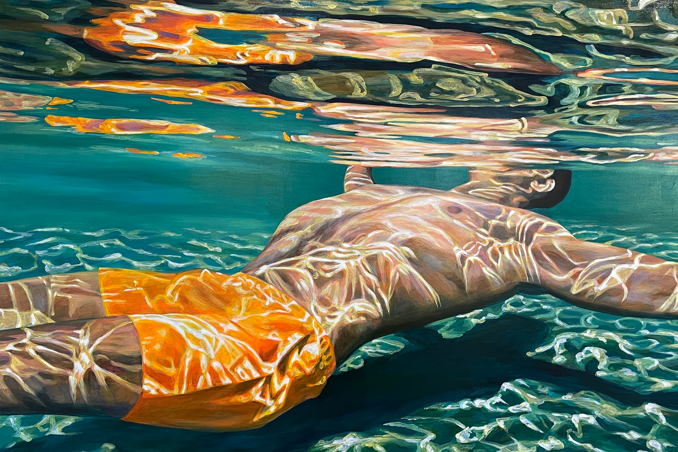 Her representational depictions are contrasted through naturally formed abstraction and surrealism. As light and reflection are set in conversation with the movement of water, Alea’s artwork is both calming and unsettling. The reflections she paints in her work change shape and distort reality into a liminal alternate universe.