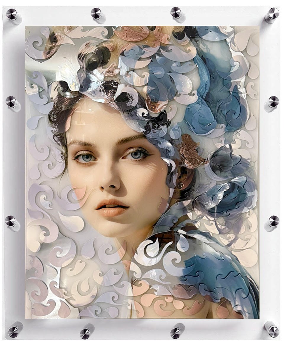 This 3D unique sculpture, titled Sonata Series, is an exquisite fusion of precision and artistry. Crafted from laser-cut thermal acrylic, each element is modeled and meticulously assembled by hand, resulting in a composition that balances structural innovation with poetic elegance. The piece is mounted on a gold mirror base, encapsulated within a crystal-clear glass box, and presented on a glass pedestal, amplifying its luminous interplay of reflection, transparency, and depth.