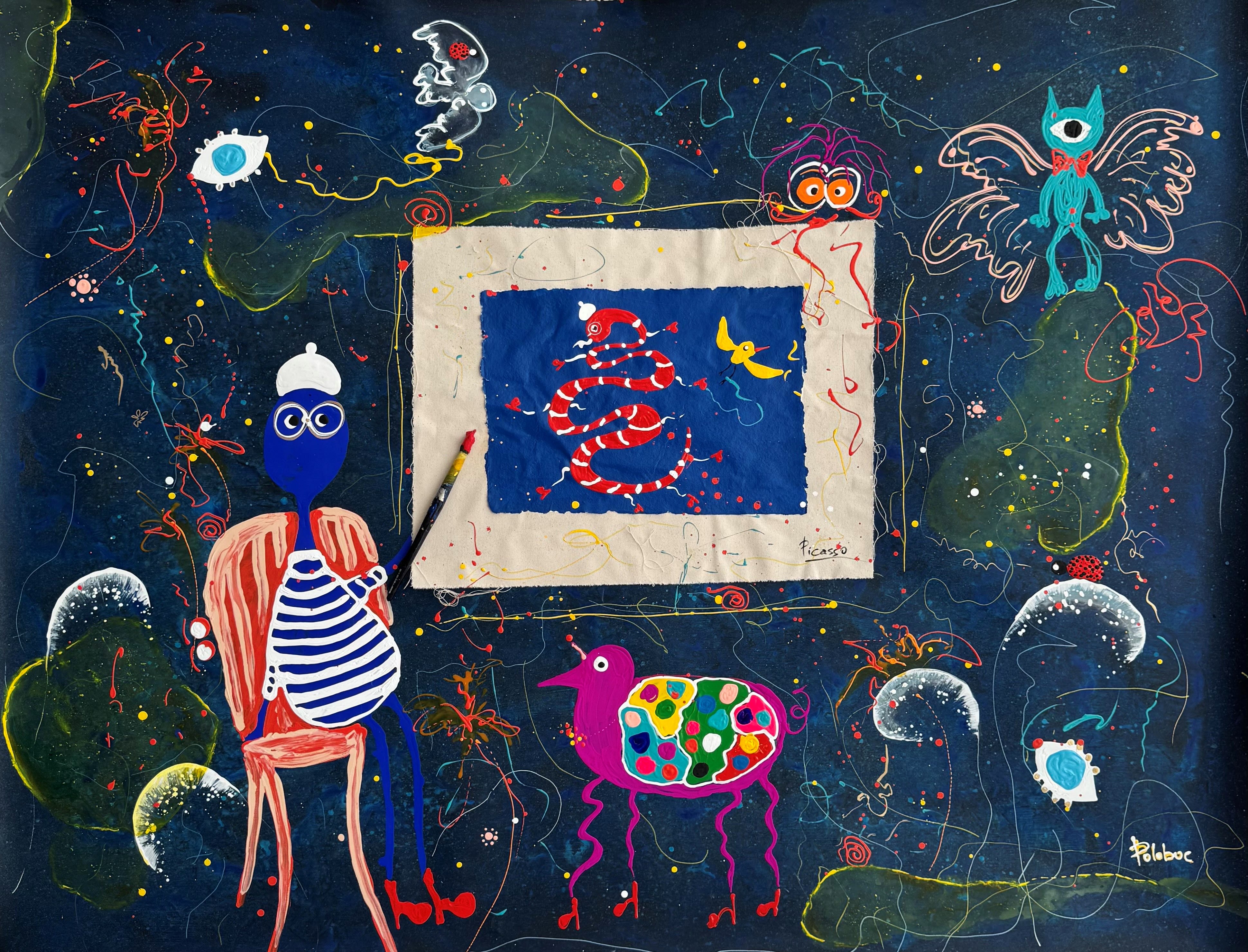In the composition, the blue character paints a canvas titled Picasso Self-Portrait. On it, a red serpent emerges —a symbol of deceit, lies, and betrayal— alongside a yellow bird, representing freedom and love. Trusting in the serpent’s goodness, the bird becomes trapped, a victim of its own innocence.