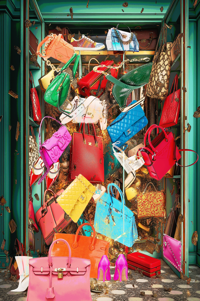 The Rapture advances Michele Utley Voigt’s Domestic Situation Series: by treating the closet as both architecture and engine. The painting opens on the instant of release: handbags and shoes vault from their shelves in a centrifugal bloom, casting shadows that read like exclamation points. The scene is humorous and high‑spirited, yet it resists caricature. Each accessory- the stand‑in for mornings, meetings, parties, private victories - holds a story, and together they assemble a portrait without a body.