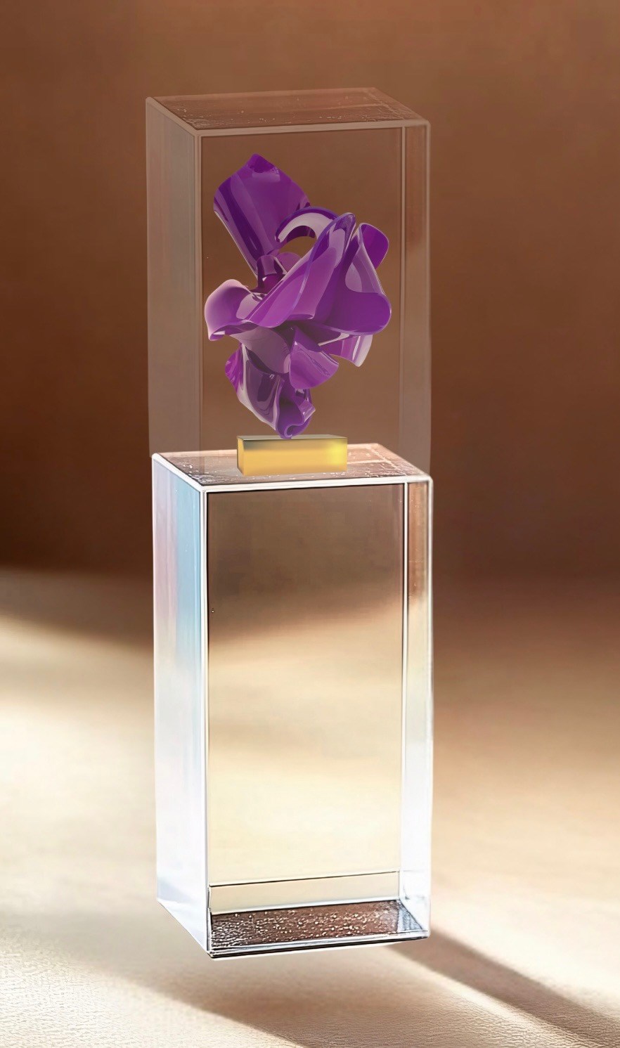 The Sonata Series evokes the harmony of a musical composition — a visual symphony where light, material, and form interact in rhythmic balance. The mirrored base and transparent enclosure create a dynamic dialogue between solidity and illusion, transforming the viewer’s perspective as they move around the piece. This work stands as part of a Special Collection, celebrating the convergence of technology, craftsmanship, and conceptual beauty in contemporary sculpture.
