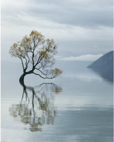 Lone willow that grows in the waters of a Lake of New Zealand